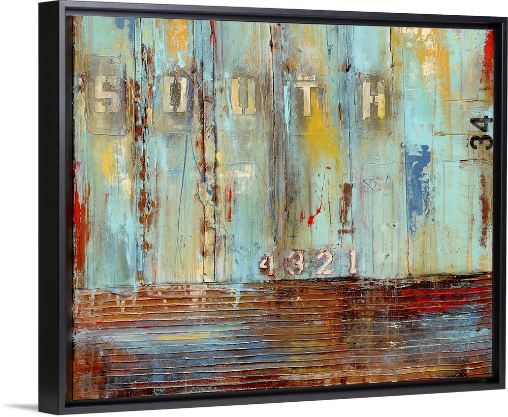 <p>Contemporary abstract painting using colors in a rustic weathered fashion with stenciled letters.</p>
