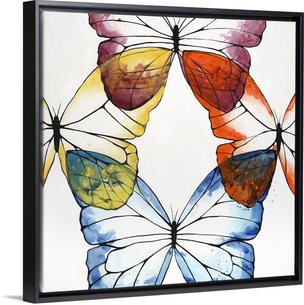 <p>Square painting of four butterflies connected by the wing on each side of the canvas with a white background.</p>