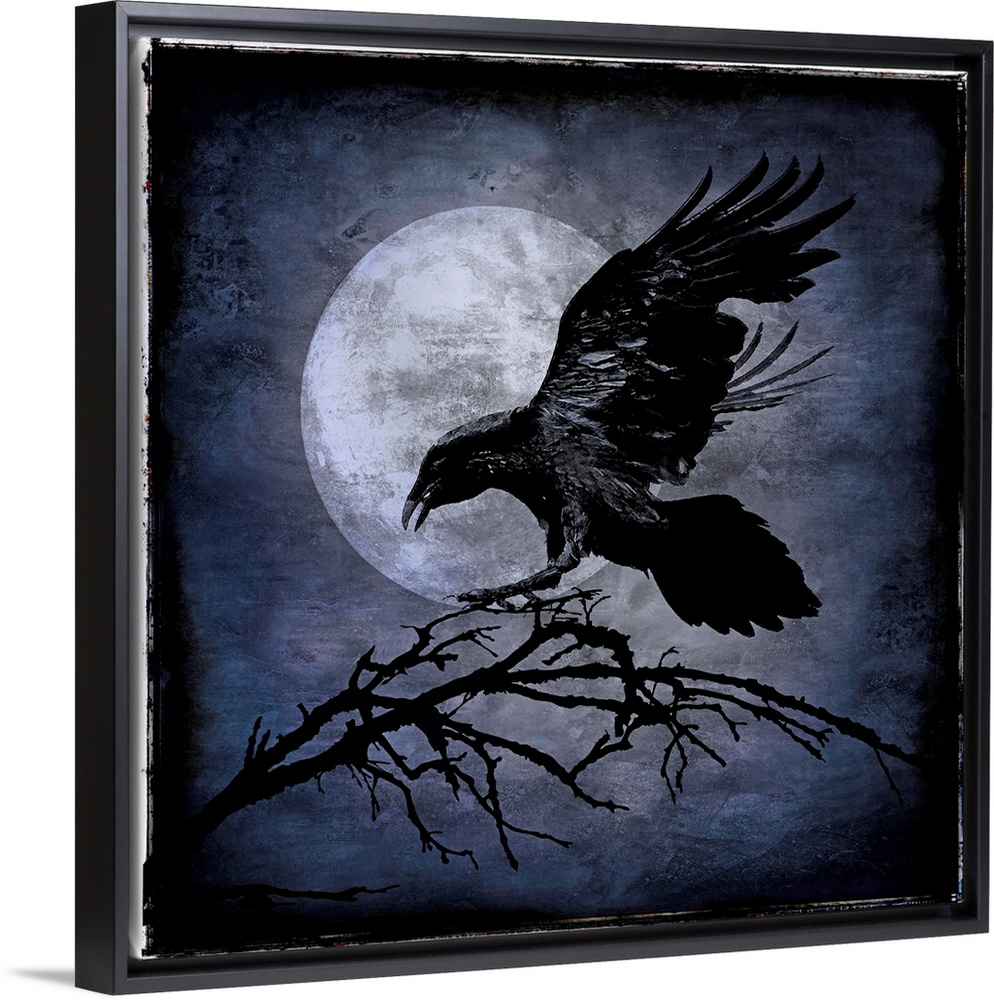 <p>Square Halloween decor with a black crow landing on a tree branch with a full moon in the background.</p>