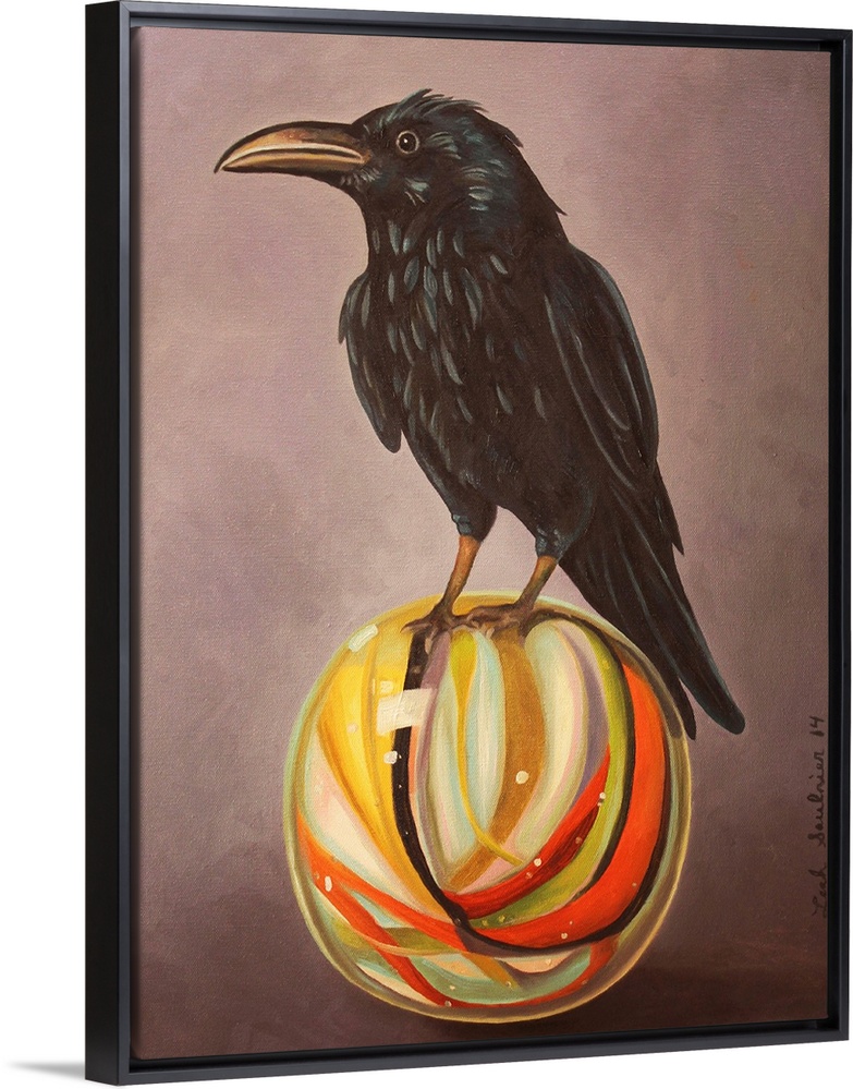 <p>Surrealist painting of a raven sitting atop a glass marble.</p>