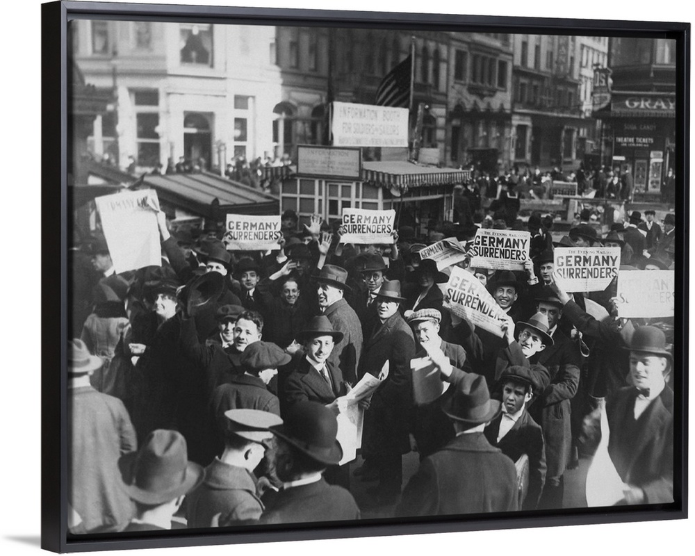 <p>Crowd at Times Square holding up Extras telling about the signing of the Armistice, 1918.</p>
