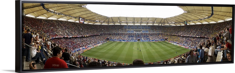 <p>Wide angle photograph of large stadium full of fans, watching a soccer game in Hamburg, Germany.</p>
