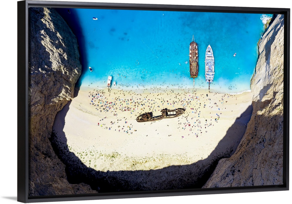 <p>Crowd of tourists sunbathing on the idyllic Shipwreck Beach (Navagio Beach), aerial view, Zakynthos island, Greek Islands, Greece, Europe</p>