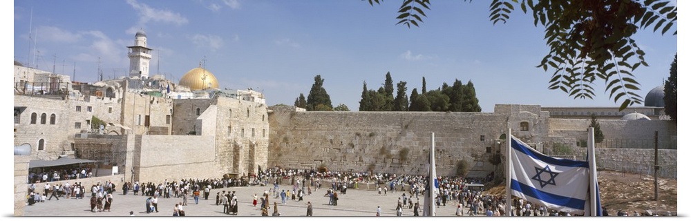 <p>Wide angle photograph of a crowd of people surrounding the Wailing Wall in Jerusalem, Israel, the Dome of the Rock can be seen in the background, against a blue sky.</p>