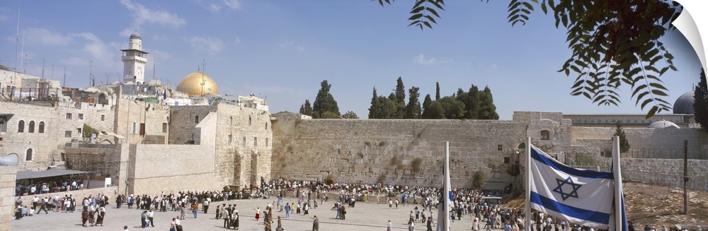 <p>Wide angle photograph of a crowd of people surrounding the Wailing Wall in Jerusalem, Israel, the Dome of the Rock can be seen in the background, against a blue sky.</p>