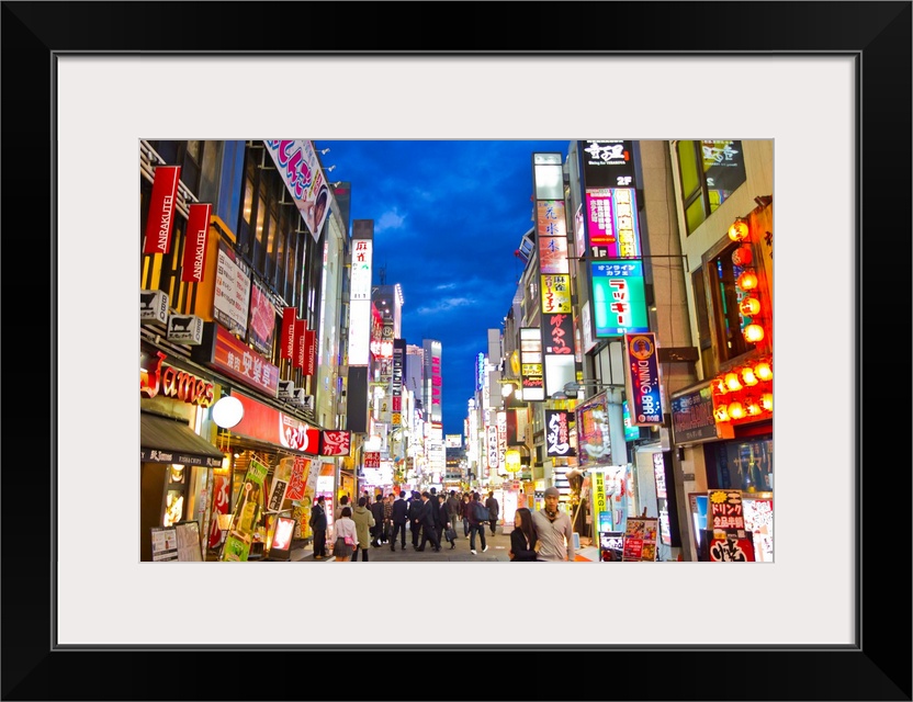<p>Crowds of people and colorful signs in the Shinjuku district.</p>