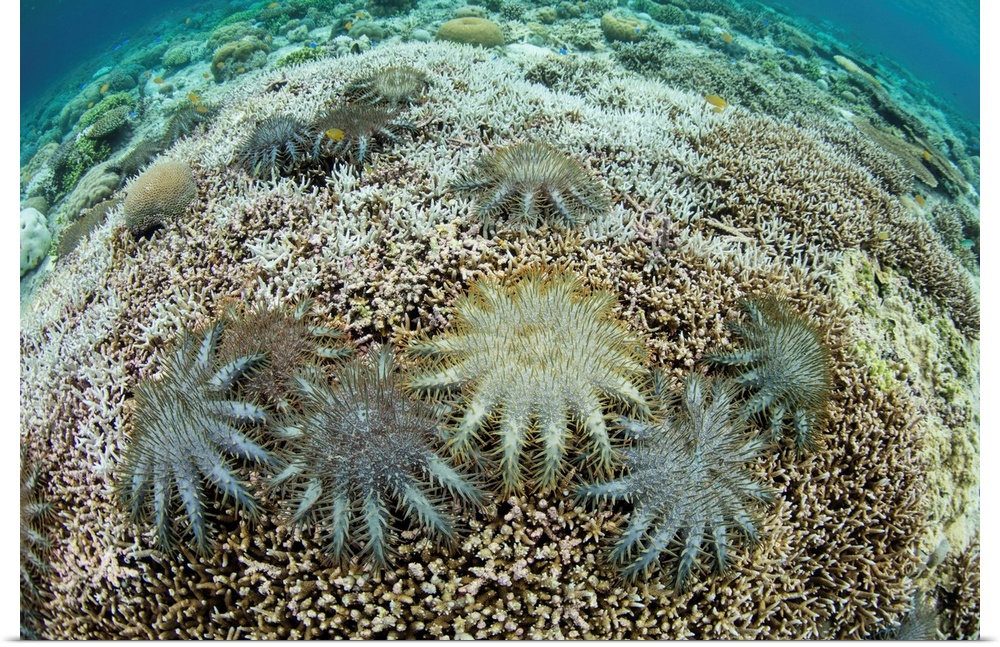 <p>Crown of Thorns starfish feed on living corals on a shallow reef.</p>