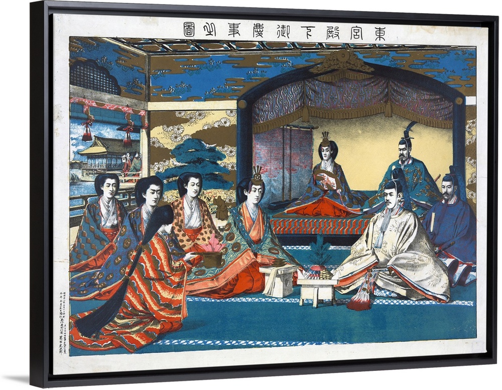 <p>Woodcut illustration of the Crown Prince and the Princess during their wedding ceremony. Meiji, Emperor of Japan, and other members of the imperial family are present. Dated 1900.</p>