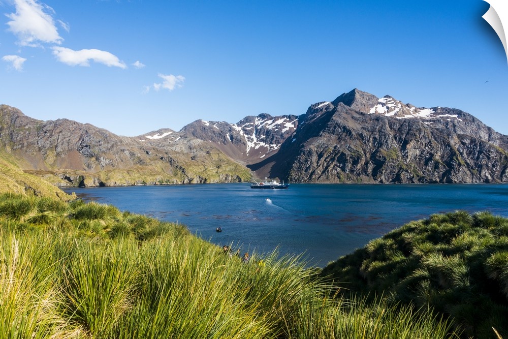 <p>Cruise ship anchoring in the bay of Godthul, South Georgia, Antarctica, Polar Regions</p>