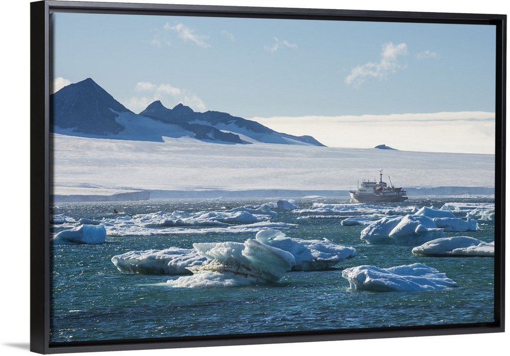 <p>Cruise ship behind icebergs, Brown Bluff, Tabarin Peninsula, Antarctica, Polar Regions</p>