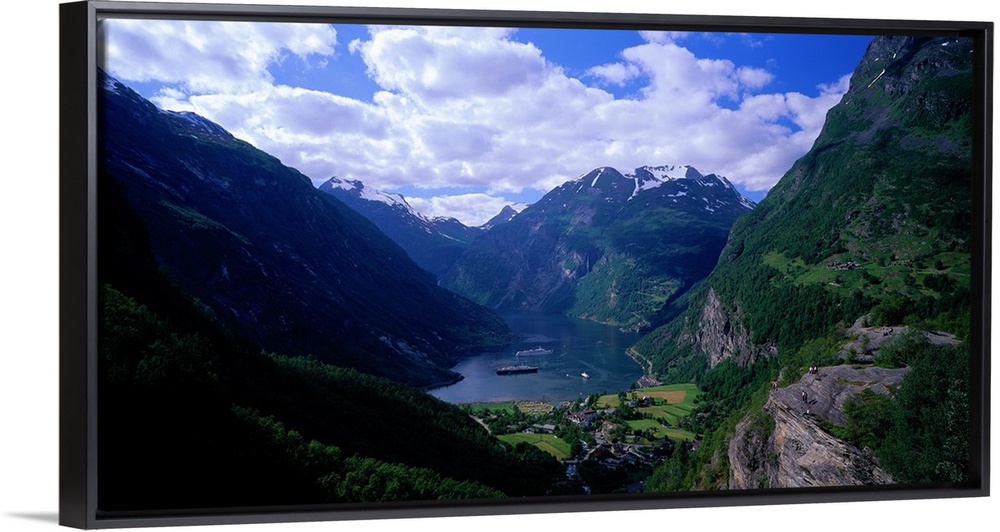 <p>Large passenger ships are photographed from a distance in between immense cliffs in Norway.</p>