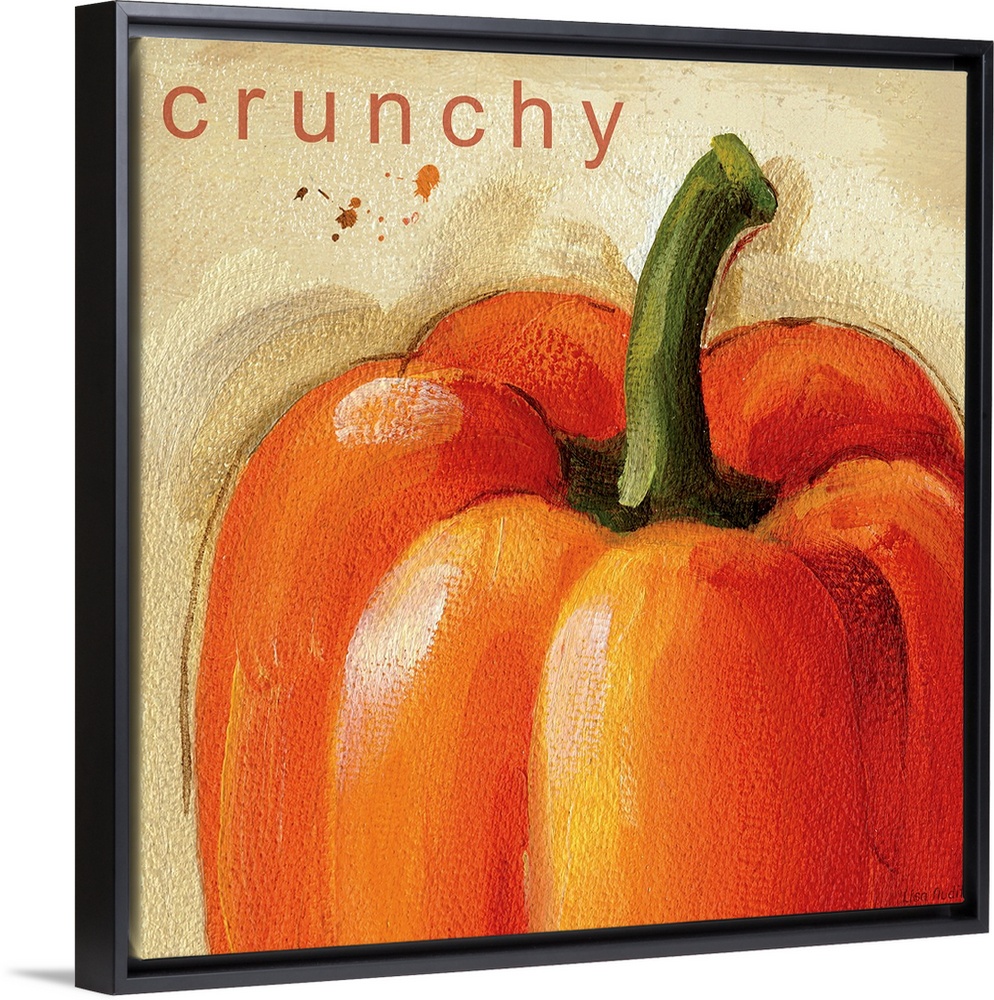 <p>Big contemporary art showcases a bell pepper with a piece of text at the top describing its texture when somebody bites into it.</p>