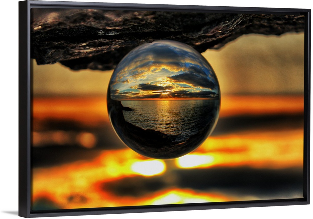 <p>A sunset seascape reflected right-side-up in an upsidedown glass ball.</p>