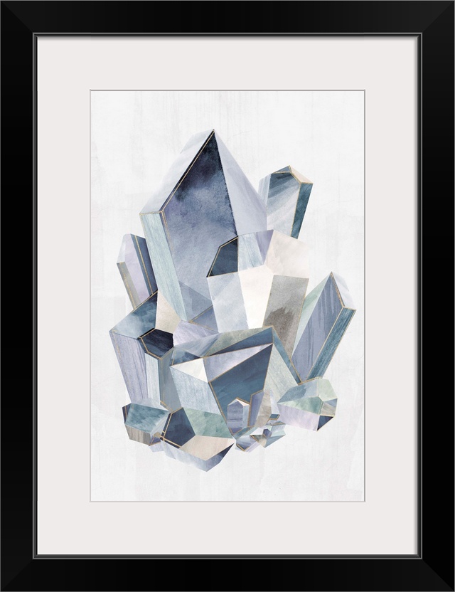 <p>Decorative wall art with rock crystal shapes compacted together in shades of blue with gray and white tones and metallic gold highlights.</p>