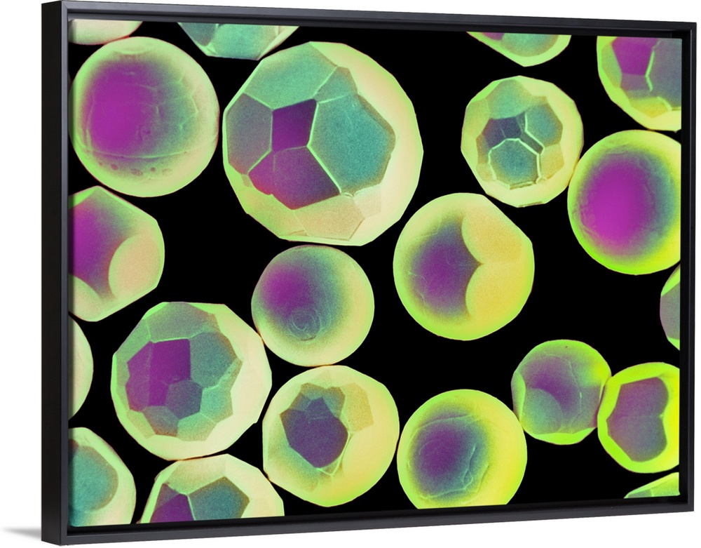<p>Cadmium powder. Coloured scanning electron micrograph (SEM) of crystals of fine cadmium powder. Cadmium (atomic number 48; atomic mass 112. 40) is a soft silver-white metallic element (symbol Cd). Cadmium occurs naturally as sulphite or carbonate in zinc ores. It is often used in batteries, electroplating and in bearings with low coefficients of friction. Cadmium is also used in control rods of nuclear reactors, because of its high absorption of neutrons. It is a highly toxic metal that, because of industrial dumping, has become an environmental pollutant. Magnification: x295 at 6x7cm size.</p>
