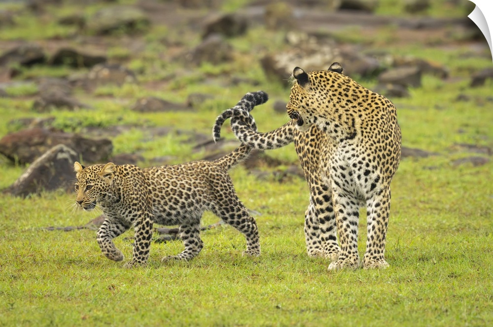 <p>Cub passes Leopard (Panthera pardus) near rocks linking tails in Maasai Mara National Reserve; Narok, Masai Mara, Kenya.</p>