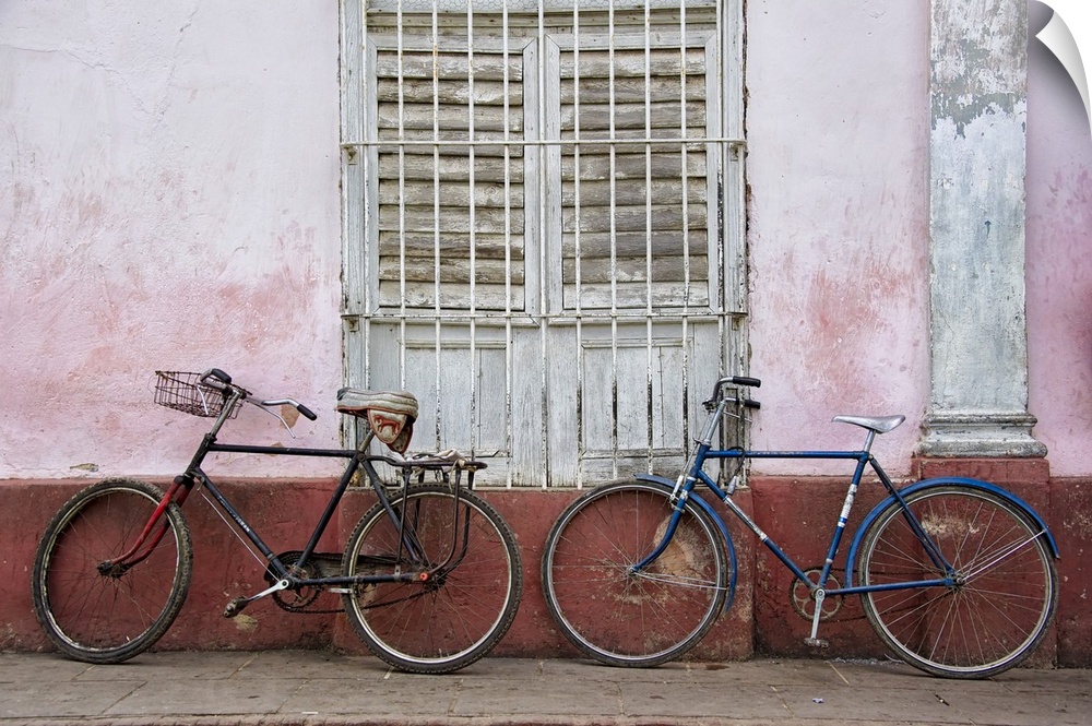 <p>Two bicycles leaning against a weathered wall in Havana, Cuba.</p>