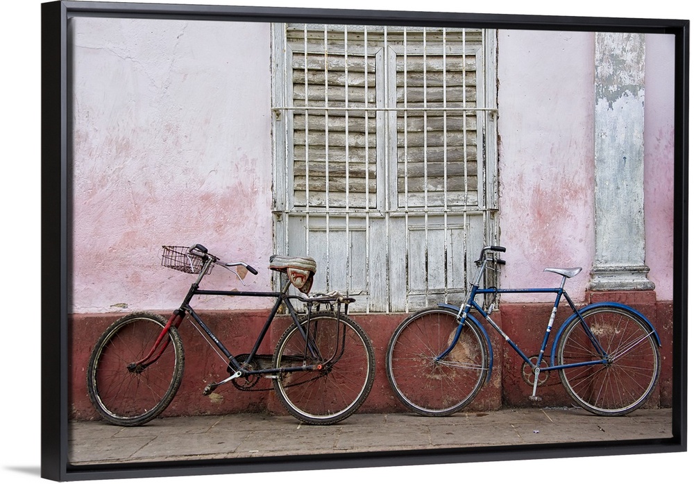 <p>Two bicycles leaning against a weathered wall in Havana, Cuba.</p>
