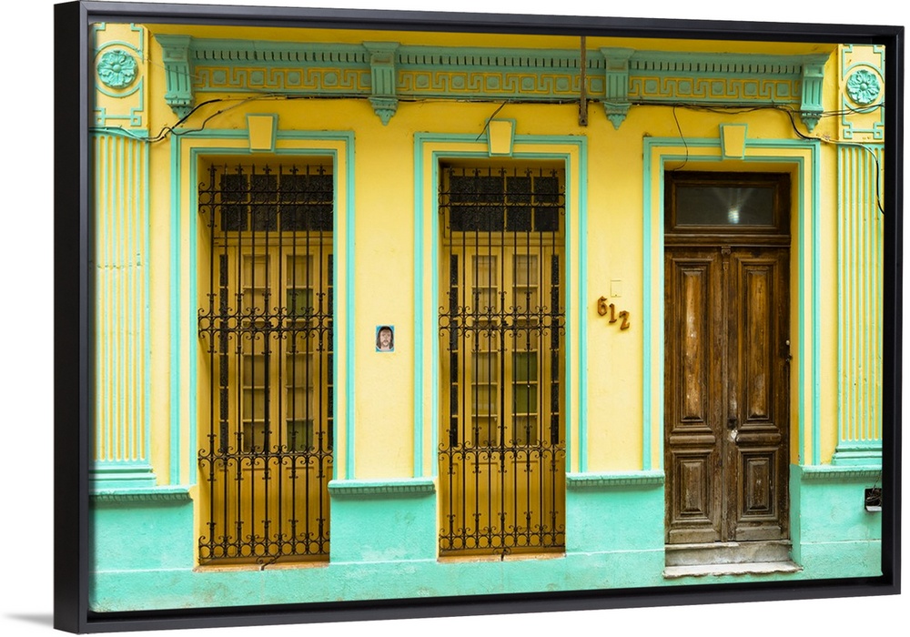 <p>Photograph of a turquoise and yellow building facade with two windows and a wooden door in Havana, Cuba</p>