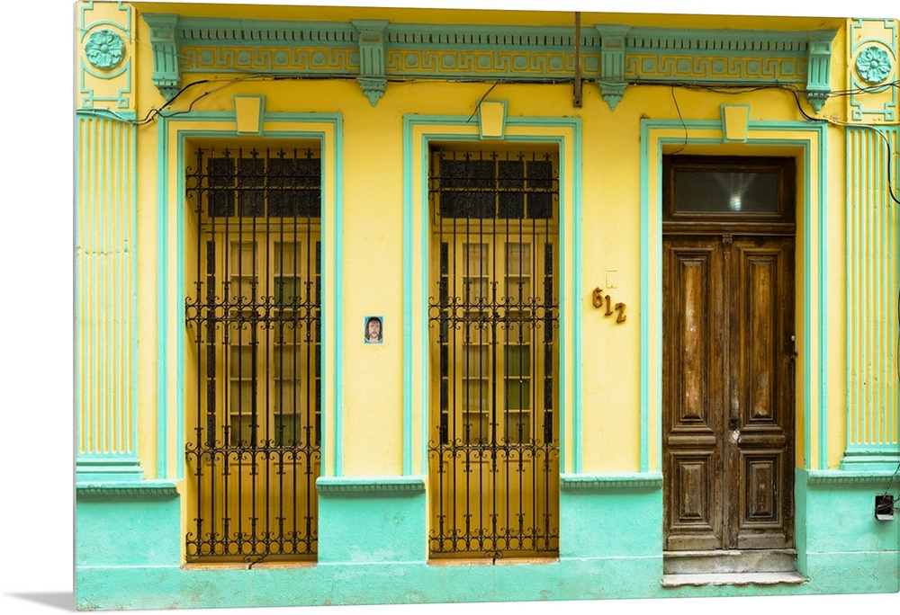 <p>Photograph of a turquoise and yellow building facade with two windows and a wooden door in Havana, Cuba</p>
