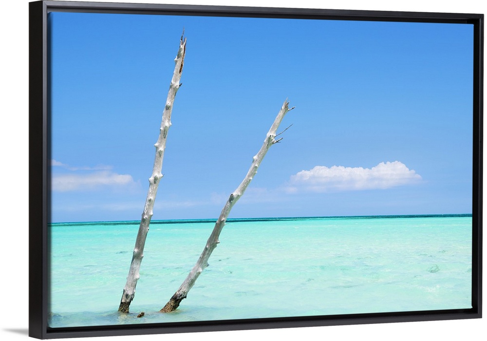 <p>Photograph of two pieces of wood sticking up through crystal blue ocean waters.</p>