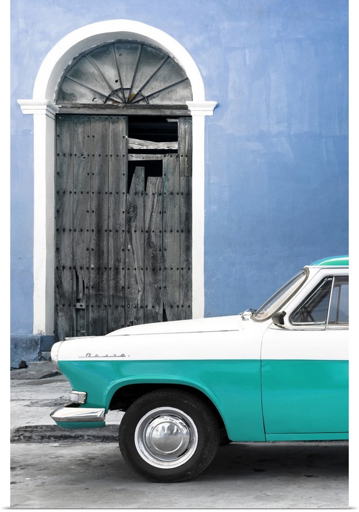 <p>Photograph of the front of a vintage turquoise and white car outside of a blue building with a broken wooden door.</p>