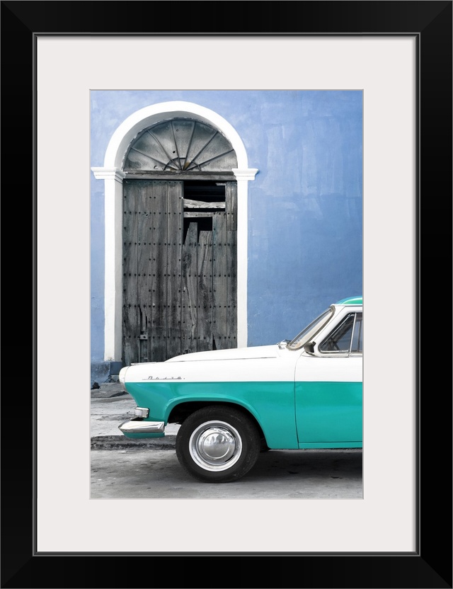 <p>Photograph of the front of a vintage turquoise and white car outside of a blue building with a broken wooden door.</p>