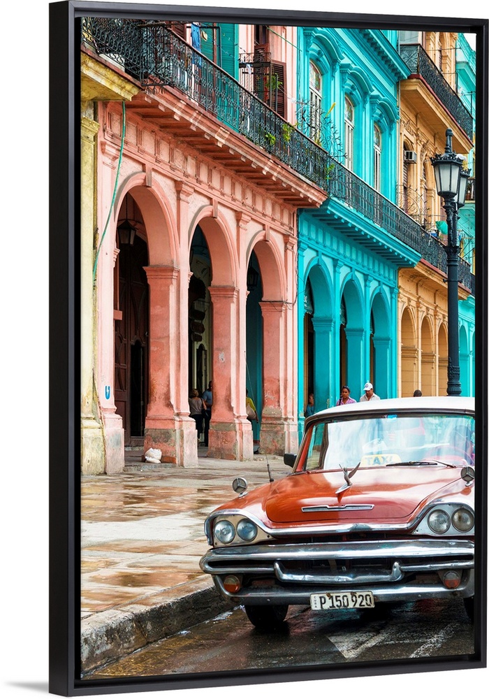 <p>Photograph of a red taxi parked on the wet streets of Havana with a colorful facade to the left.</p>