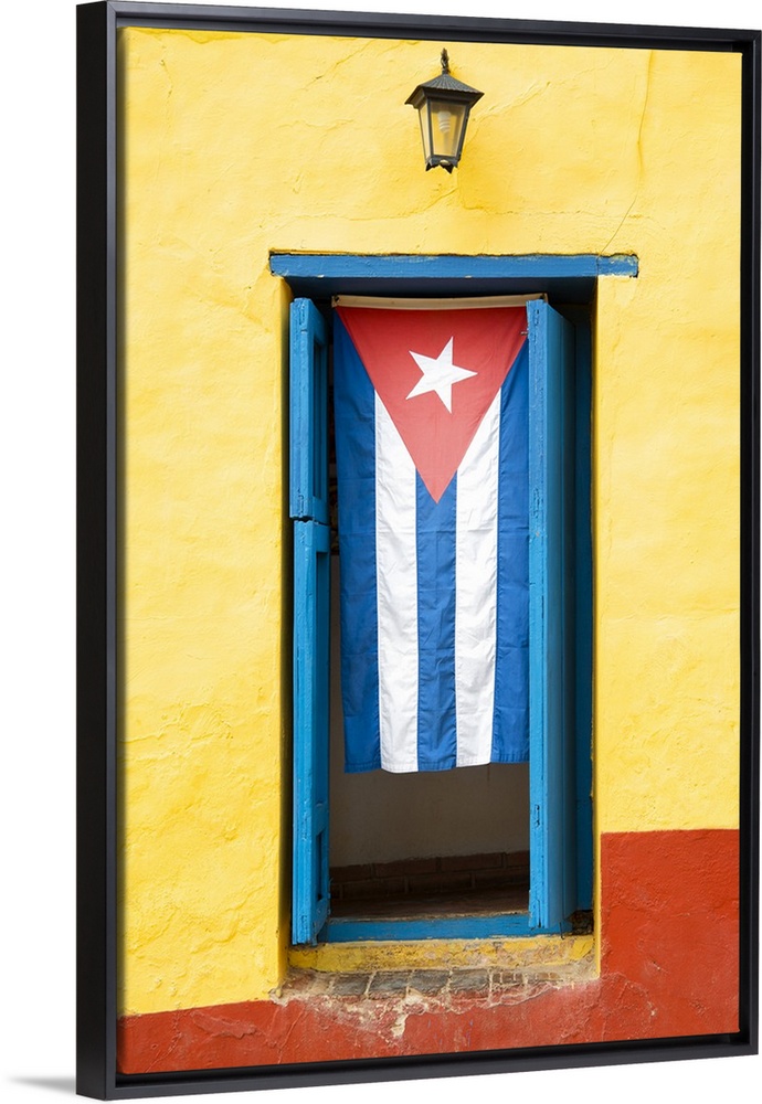 <p>Photograph of the Cuban flag hanging in a window on a yellow and red wall in Havana.</p>