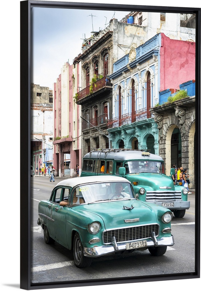 <p>Photograph of two green vintage Chevrolets in a Havana street scene.</p>
