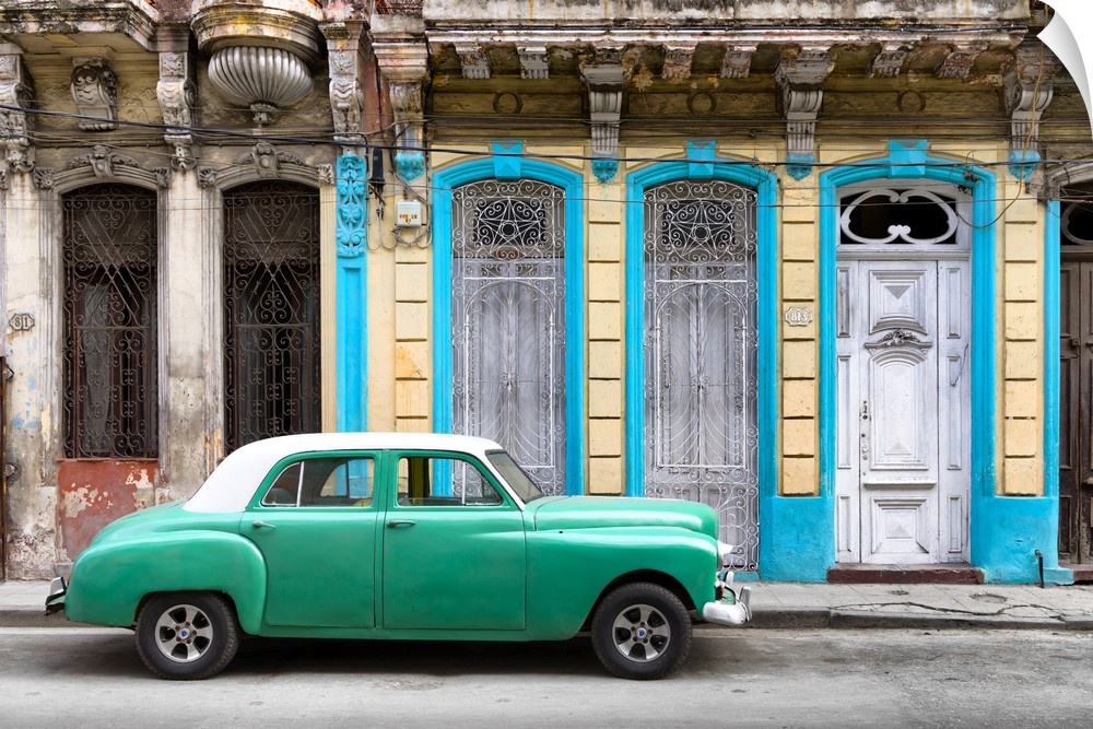 <p>Photograph of a green vintage car with a white roof parked on the street in front of a blue and yellow building.</p>