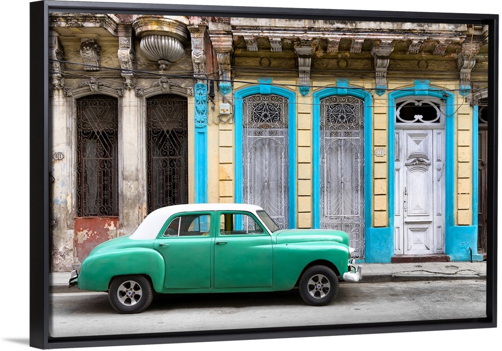 <p>Photograph of a green vintage car with a white roof parked on the street in front of a blue and yellow building.</p>
