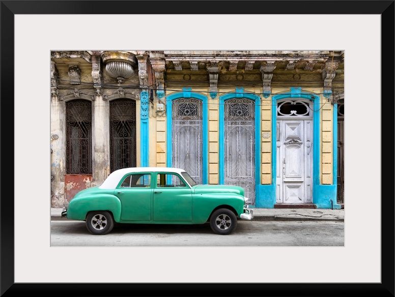 <p>Photograph of a green vintage car with a white roof parked on the street in front of a blue and yellow building.</p>