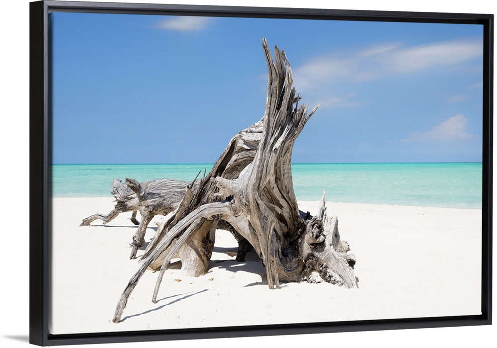 <p>Photograph of a large piece of driftwood on the shore of a crystal blue beach.</p>