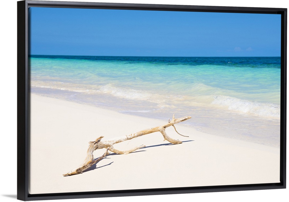 <p>Landscape photograph with a piece of driftwood in front of a crystal blue ocean in Cuba.</p>