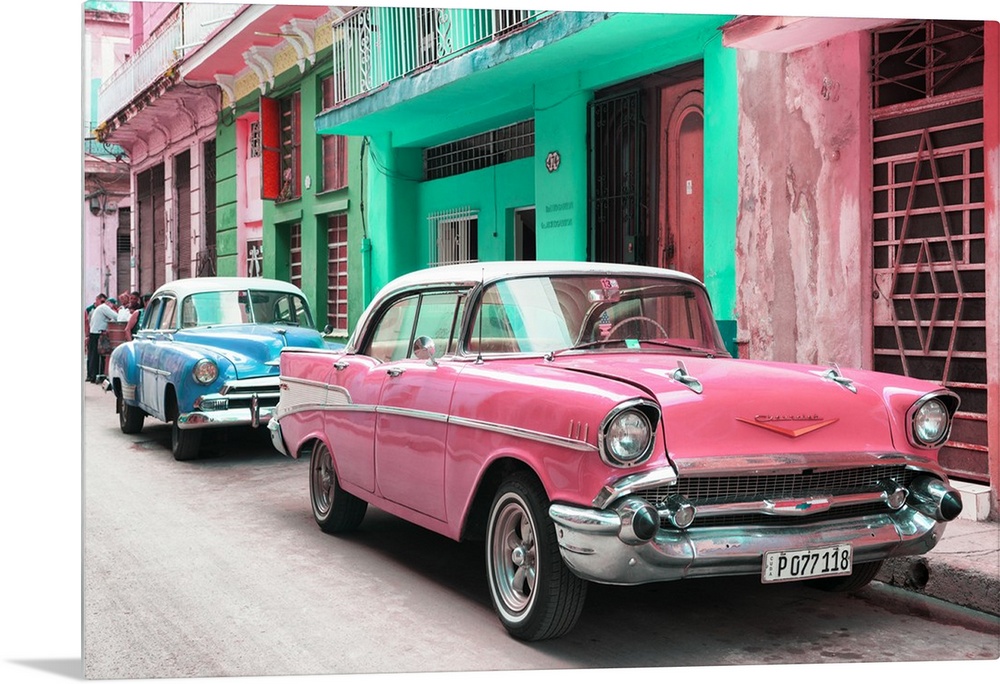 <p>Photograph of a pink Chevrolet parked outside of brightly colored Cuban facades.</p>