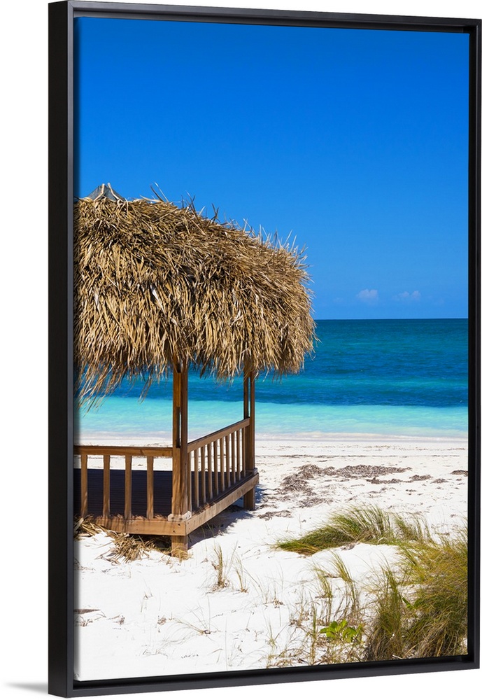 <p>Relaxing photograph of a cabana on the white sands of a Cuban beach with beautiful blue water in the background.</p>