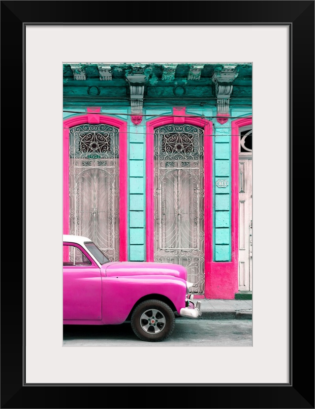 <p>Photograph of a bright pink vintage car parked outside of a beautiful old building with a bright pink and light blue facade.</p>