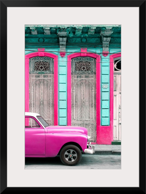 <p>Photograph of a bright pink vintage car parked outside of a beautiful old building with a bright pink and light blue facade.</p>