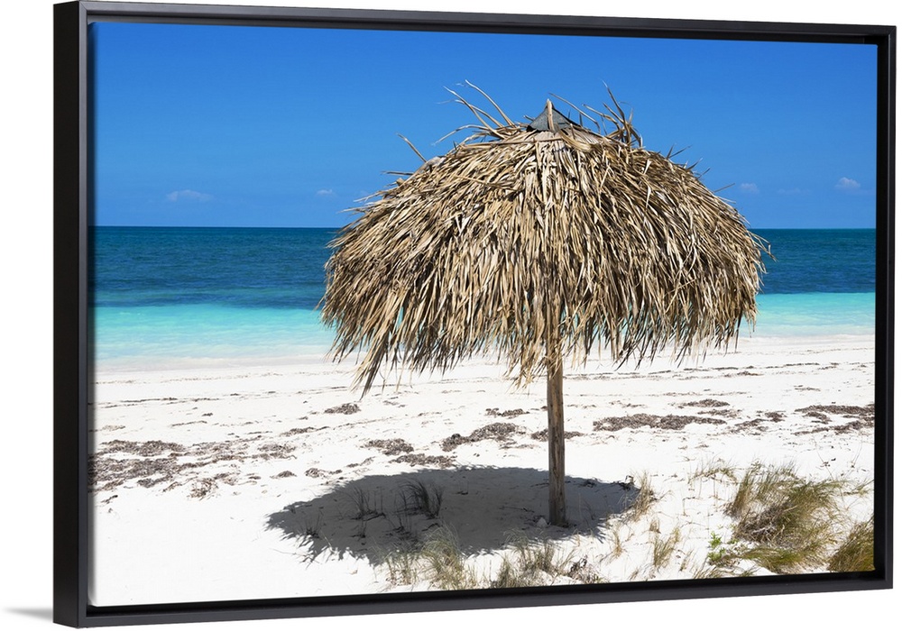 <p>Photograph of an umbrella made with natural materials on a beautiful beach in Cuba.</p>