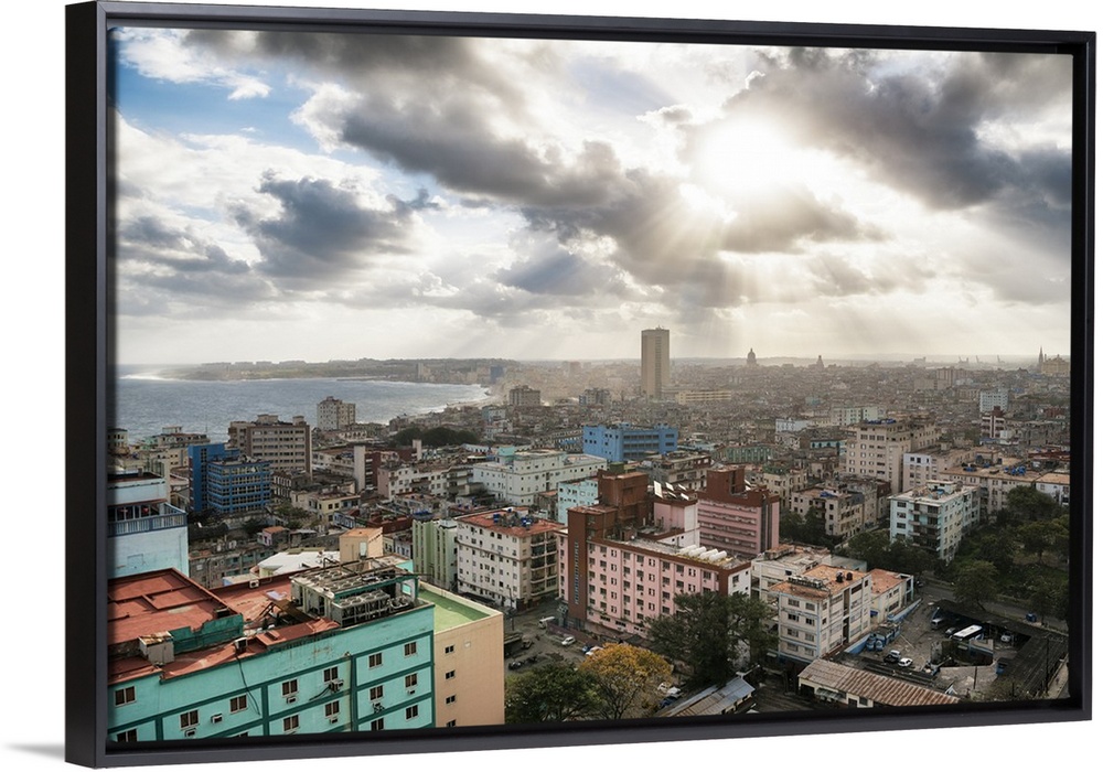 <p>Photograph of the sun beaming through the clouds of the city of Havana.</p>