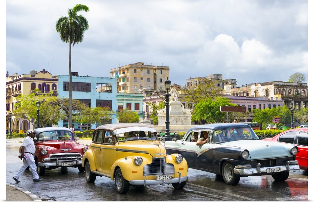 <p>Photograph of a cloudy sky above a wet Havana street scene with vintage cars and taxis.</p>