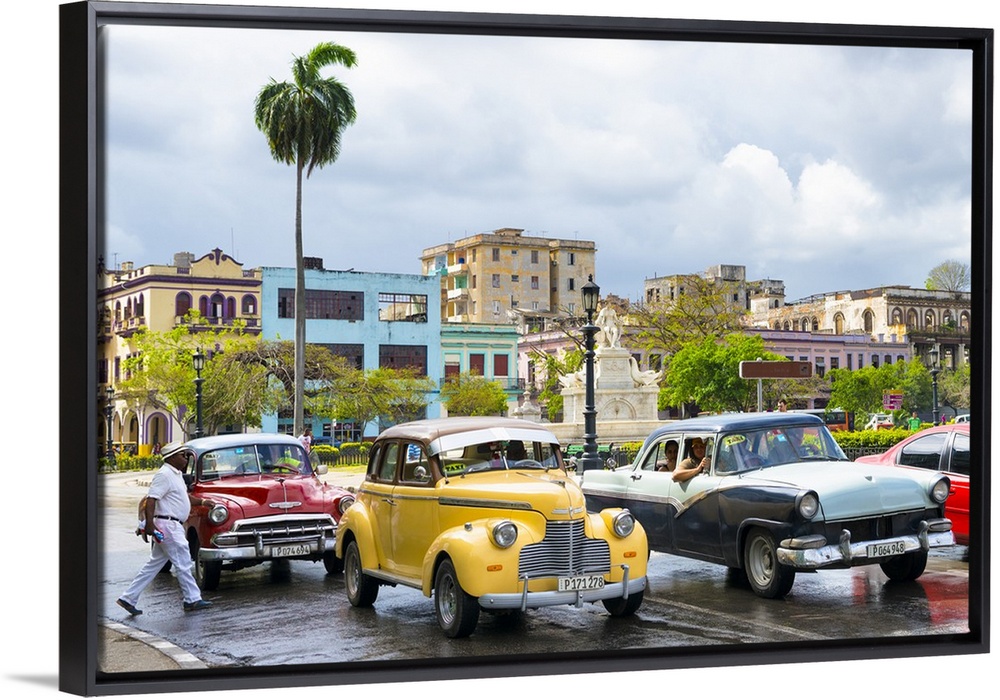 <p>Photograph of a cloudy sky above a wet Havana street scene with vintage cars and taxis.</p>