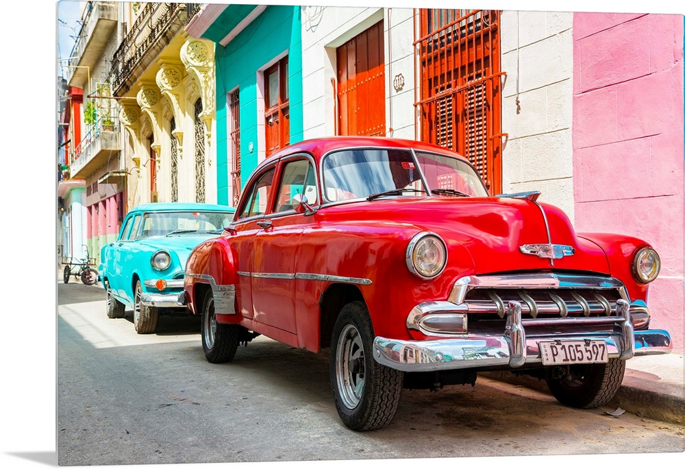 <p>Photograph of a turquoise and a red vintage Chevrolets parked along a colorful Havana street scene.</p>
