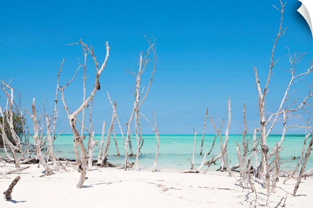 <p>Photograph of wood sticking up through crystal blue ocean water on a white sandy beach.</p>