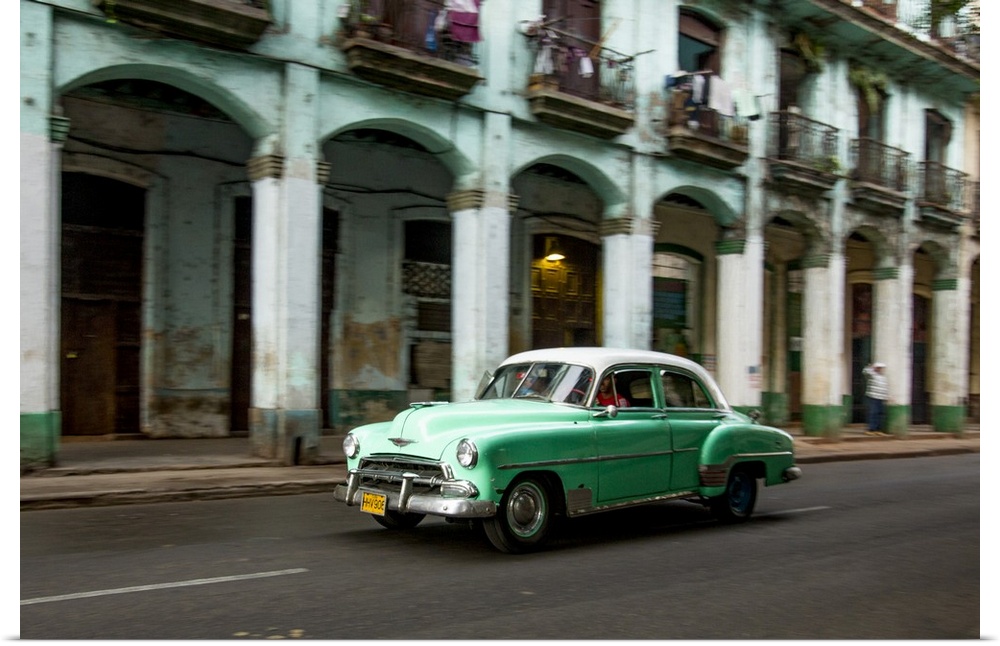 <p>Cuba, Havana, classic green car and arches of colonial building. .</p>