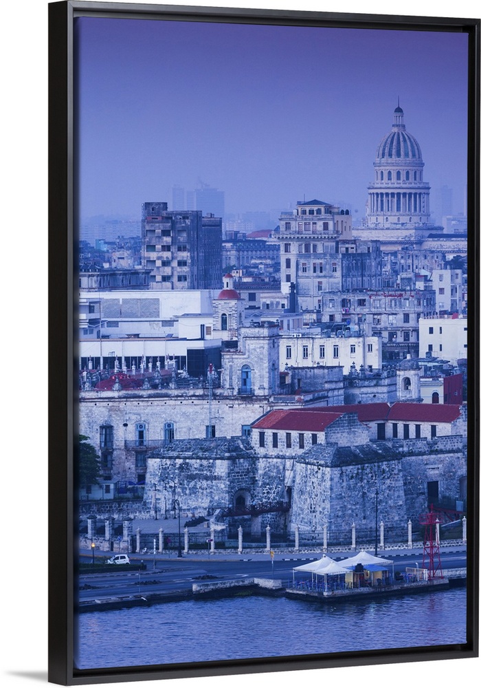 <p>Cuba, Havana, Havana Vieja, elevated view of buildings along Havana Bay, dawn</p>