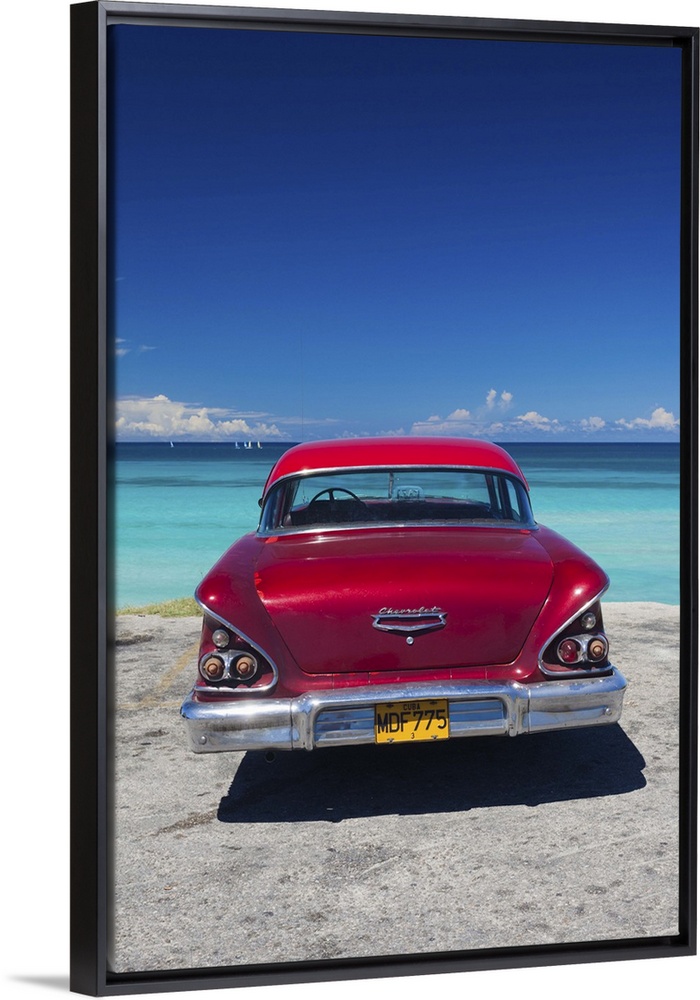 <p>Cuba, Matanzas Province, Varadero, Varadero Beach with 1958 US-made Cheverlot</p>