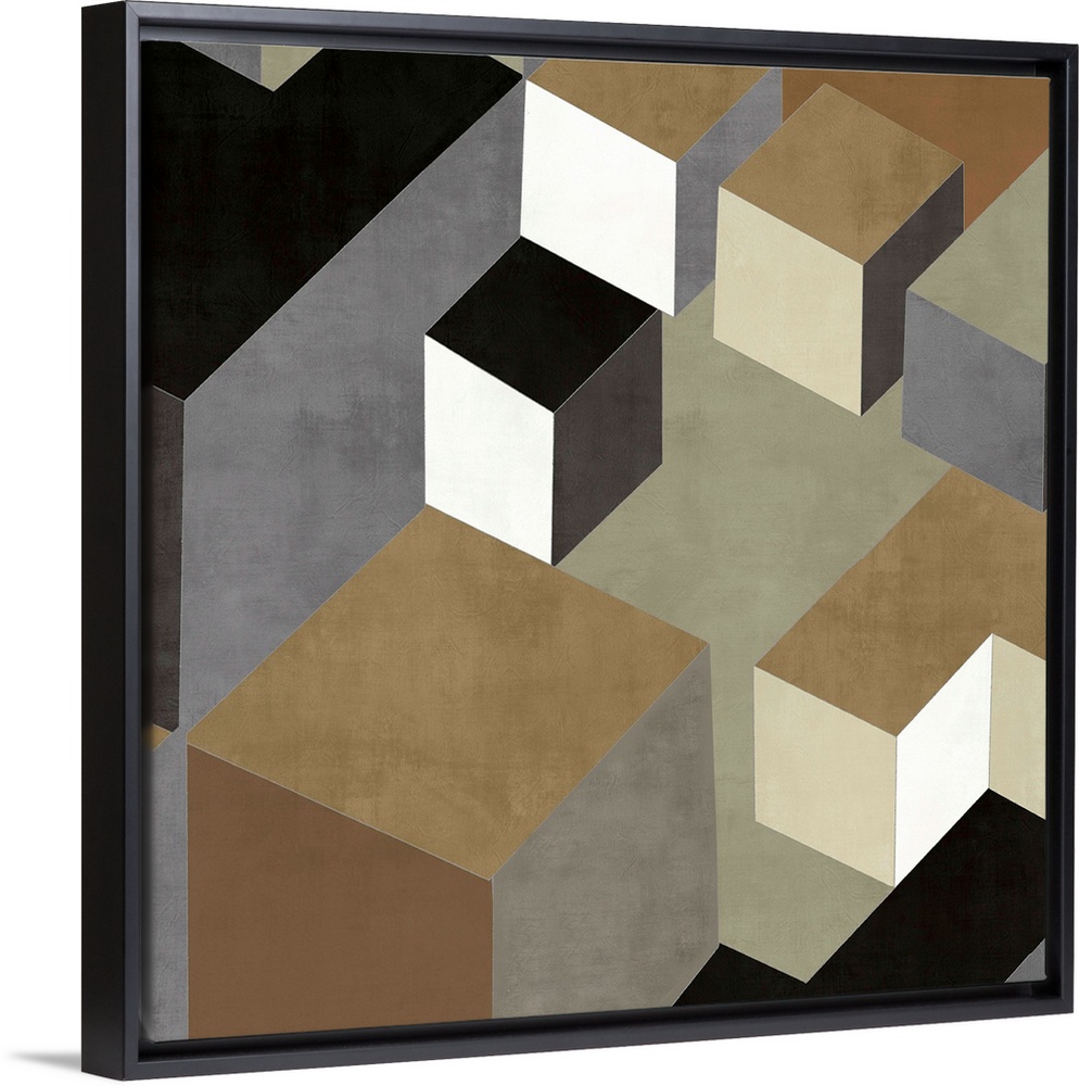 <p>Abstract square art created with black, white, gold, silver, and brown squares creating 3D looking cubes and rectangles.</p>