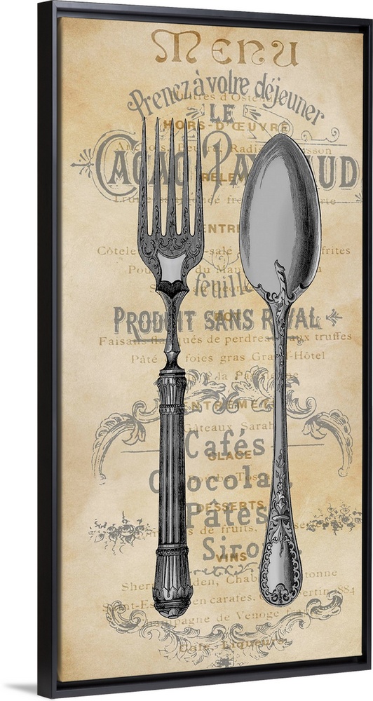 <p>Kitchen decor with an illustration of a spoon and fork in the foreground and text in the background.</p>